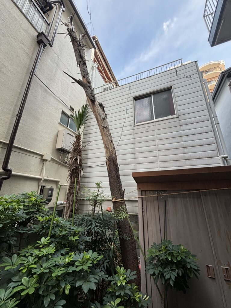 中庭でありながら重機が入らない、さらに脚立すら使えない条件下での作業でしたが、ベランダからロープを使っての吊り伐採により、周囲に被害を与えることなく作業完了。