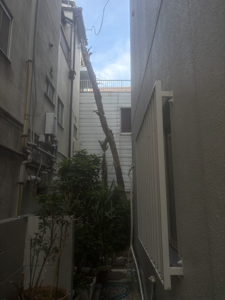 今回の「大阪市 枯木 伐採」事例では、重機が入らず、脚立も立てられない中での難工事となりました。
