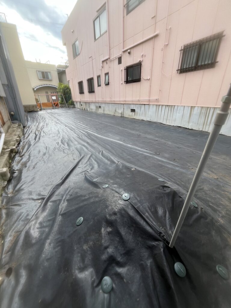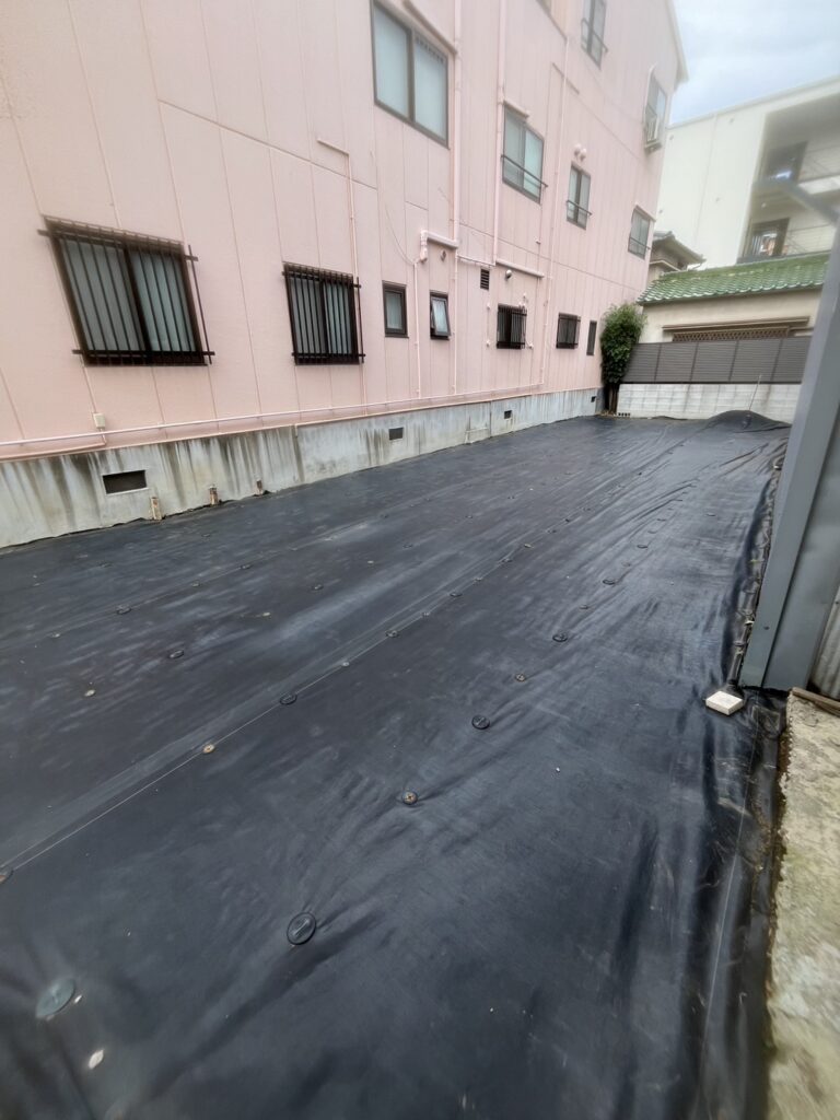 シートの上に散布された除草剤の白い粉も確認でき、今後の雑草対策も万全な仕上がりです。