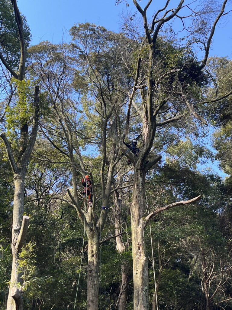 これはロープや専用装備を使用し、作業員が樹木に登って上から分解していく高度な技術です。
