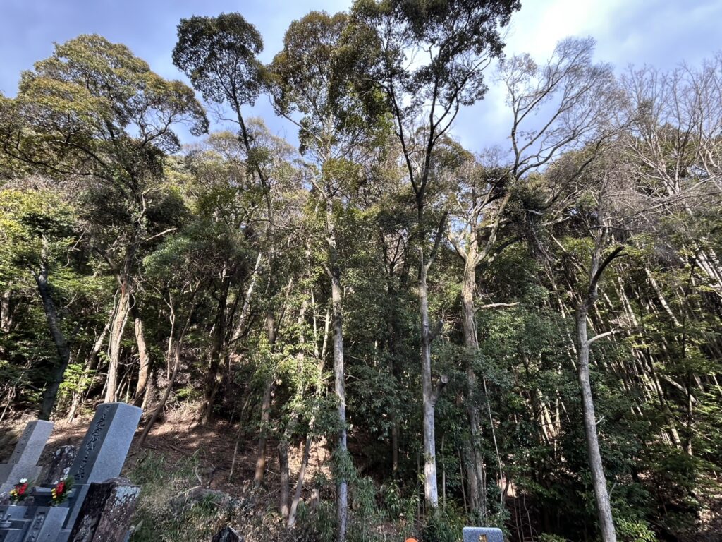 現地を確認すると、墓地の背後には高さ約10m~15mほどの樹木が密集しており、その中にはすでに墓地側へ越境している木や、枯れかけて倒木の危険性が高い木が多数確認されました。