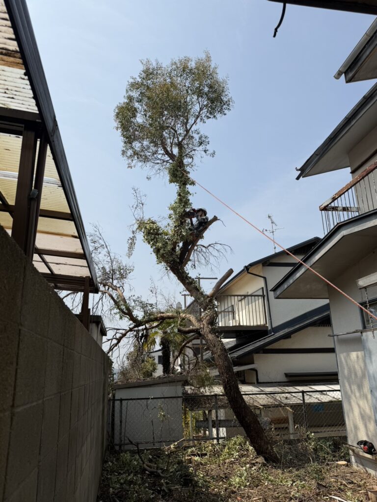 作業中は、ロープを使用した分解作業により、高木を上部から慎重に伐採し、周囲への影響を抑えながら進めました。