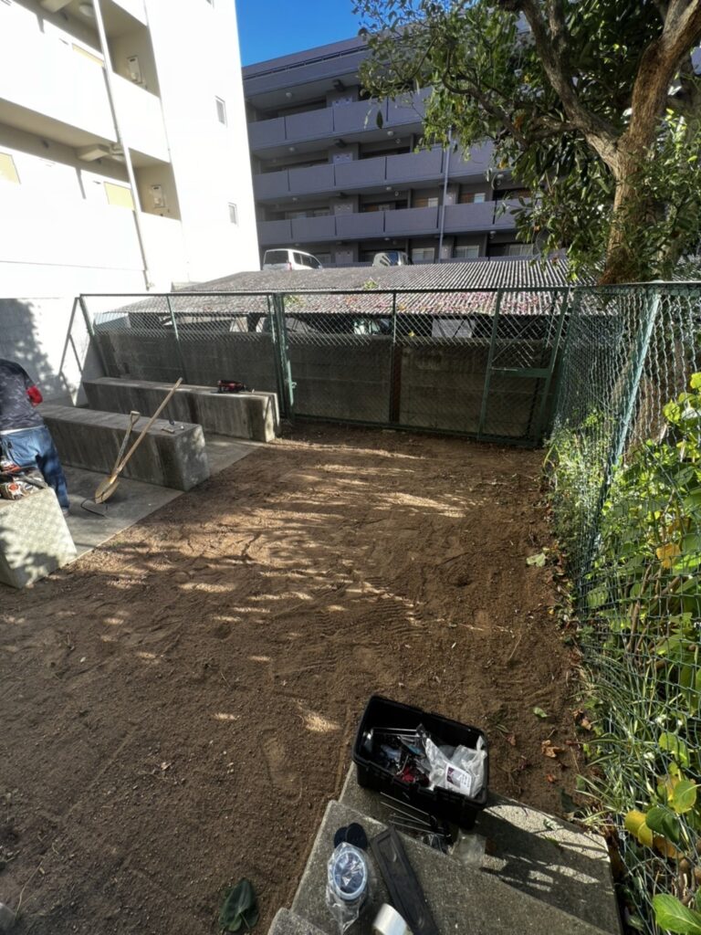 とのご要望をいただき、当社では、草刈り作業から始まり、地盤の整地、防草シートの施工、そして人工芝の敷設までを一貫して対応しました。