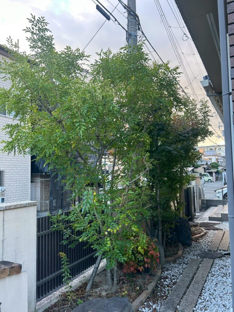 お庭にはシマトネリコやモミジが植えられており、ナチュラルで雰囲気の良い空間ではあるものの、枝葉が混み合い、全体的に少し重たい印象になっている状態でした。
