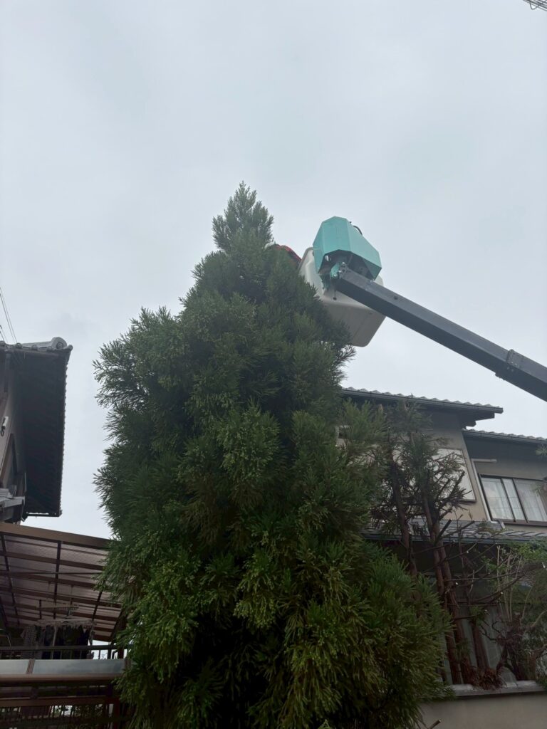 ✅特にスギは細長く風に揺れやすいため、高所作業車にて慎重に切り詰め剪定