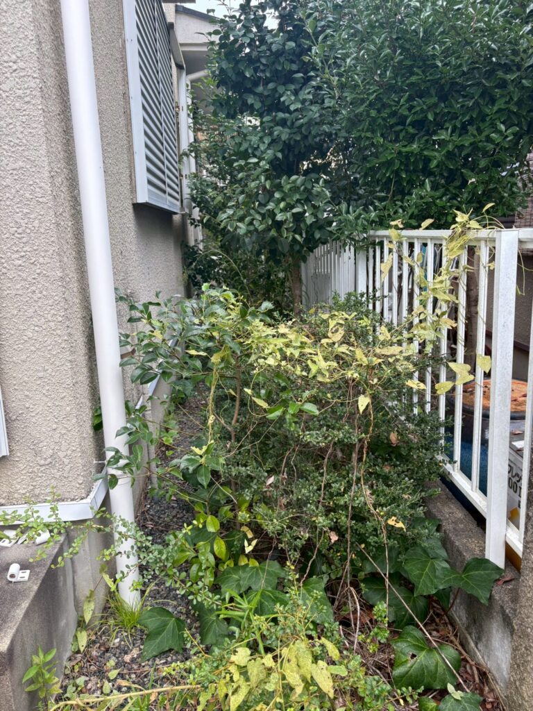 今回は、通路や庭の境界が分かりにくいほど成長してしまった樹木や、植えた覚えのない実生木などを伐採・除草し、地面が見える状態まで整える作業を行いました。